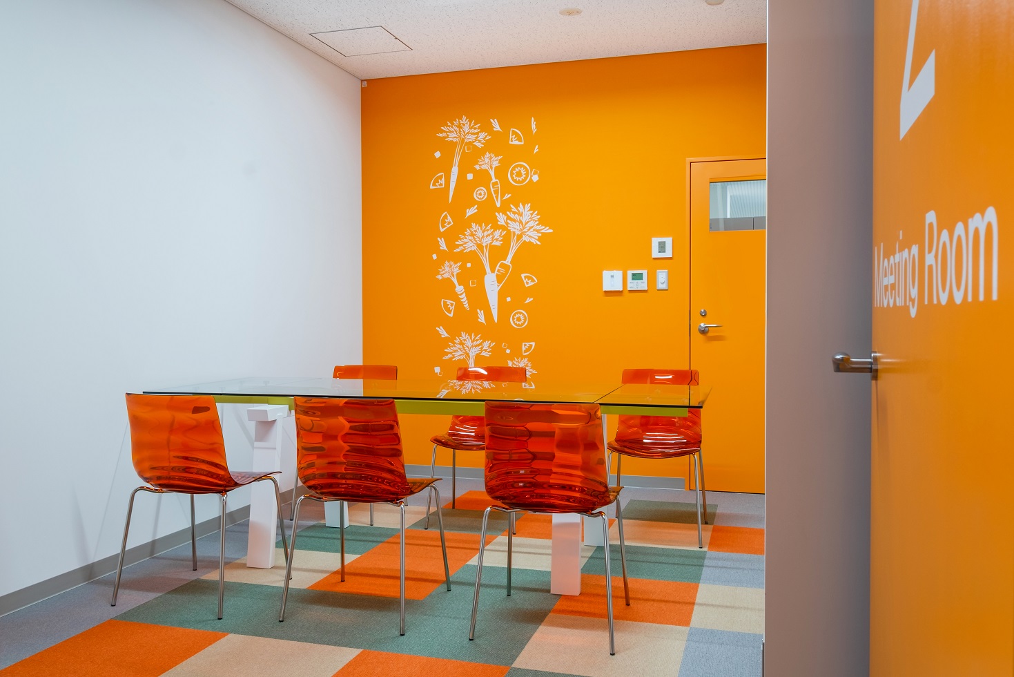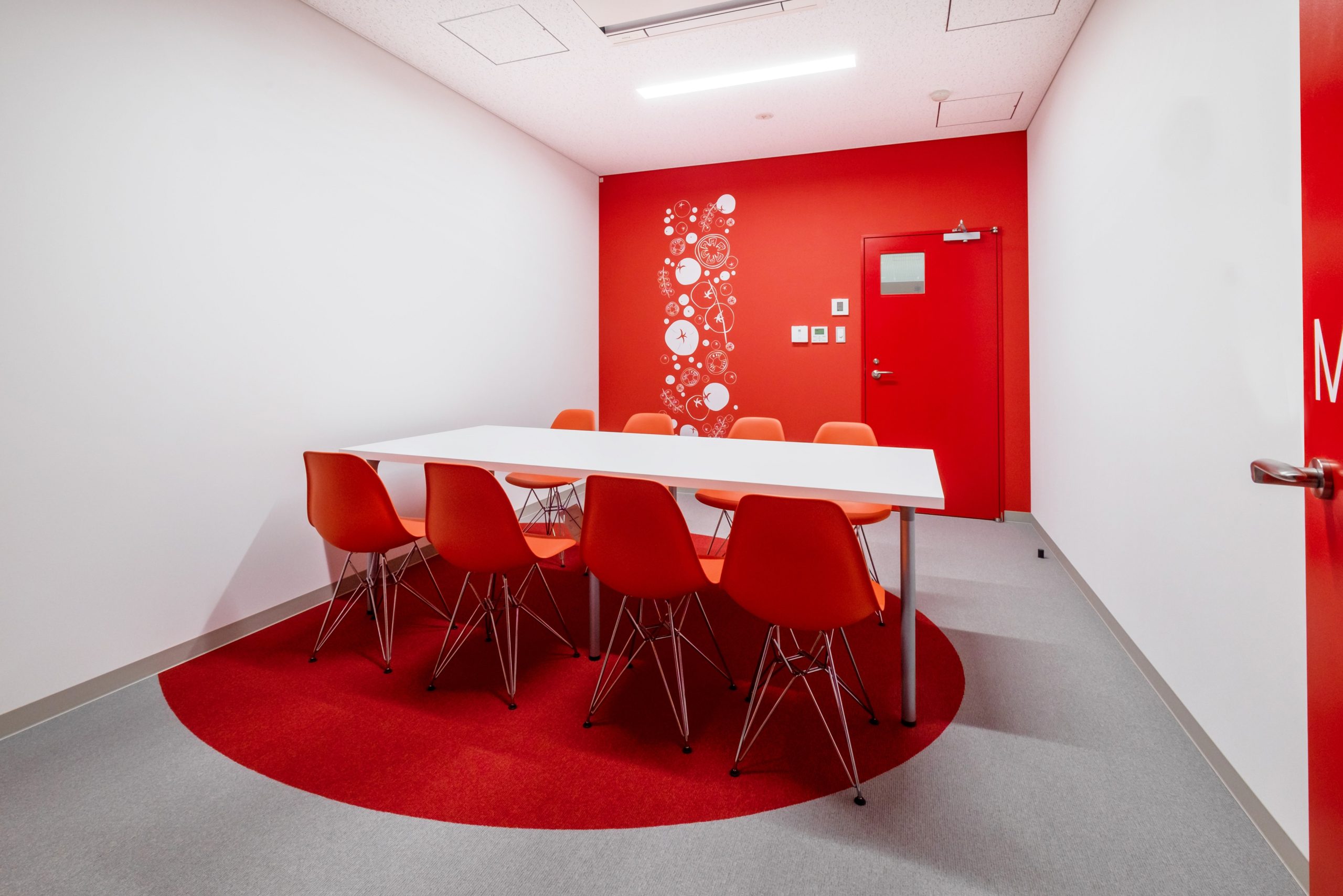 エントランスや会議室ではコーポレートカラーをメインとし、POPで遊び心のある空間に。フリースペースでは会議室とはテイストを変え、落ち着いた色を基調とする空間に仕上げました。会議室は様々な場面に合わせて利用できるデザインを施すことで、効率的なコミュニケーションが取れるような空間にしました。