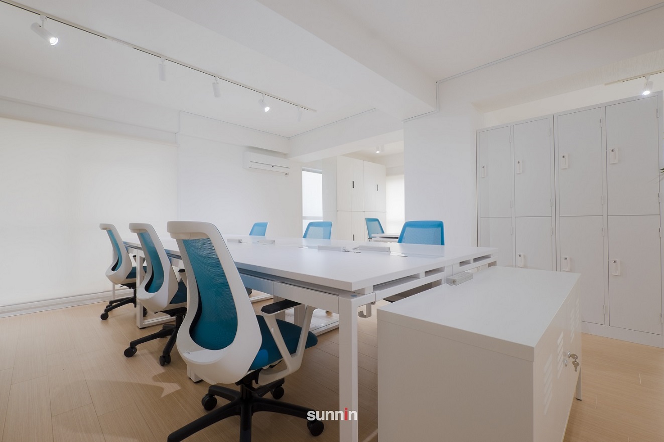オフィス家具を一新し、空間のデザインも練り直しました。 開放感と明るい雰囲気を空間に持たせるため、床はナチュラルの木材、家具はホワイトとパステルカラーを用いています。