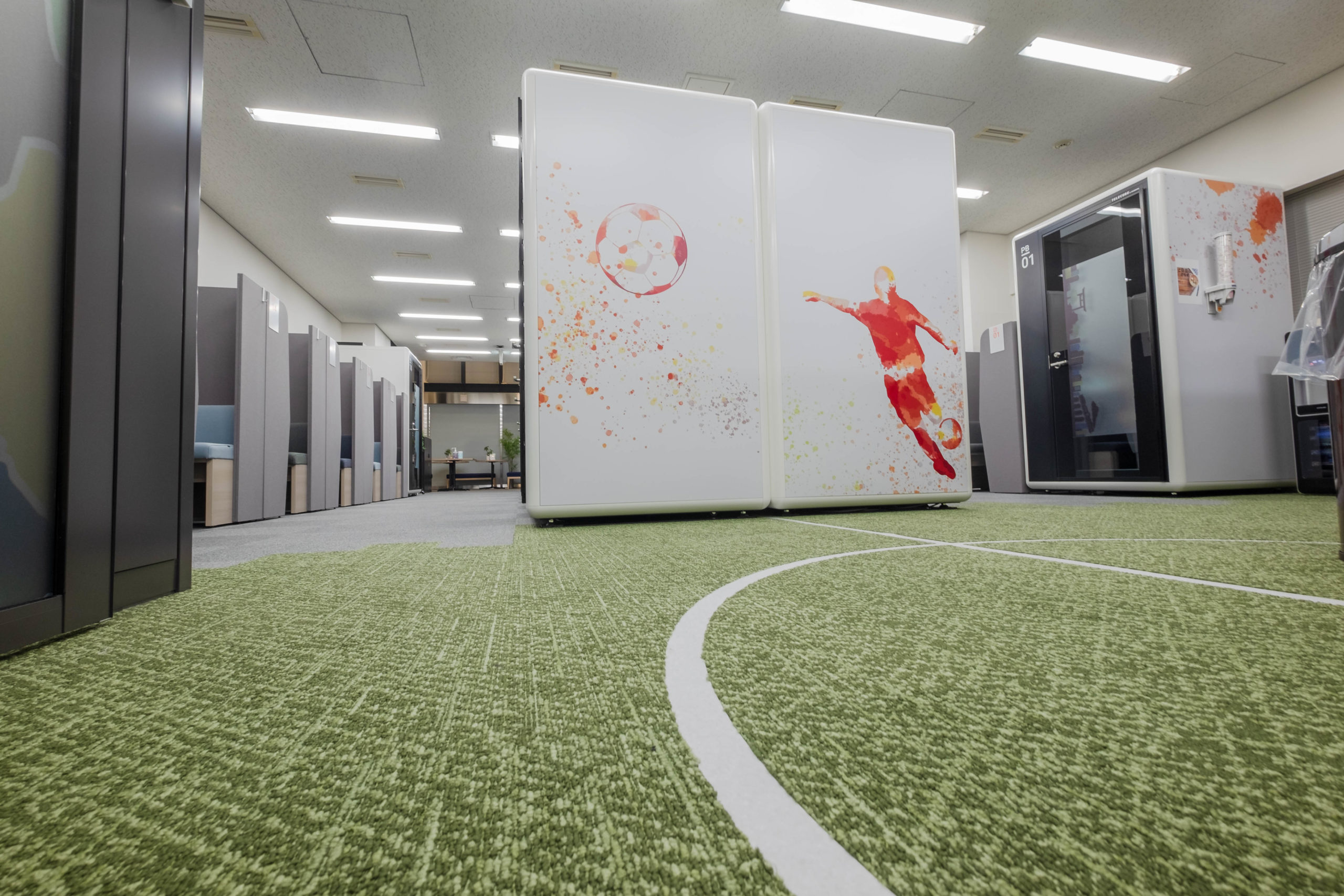 床の貼り分けはサッカーのフィールドをイメージしたデザインを施し、地域に根ざした空間デザインに仕上げました。