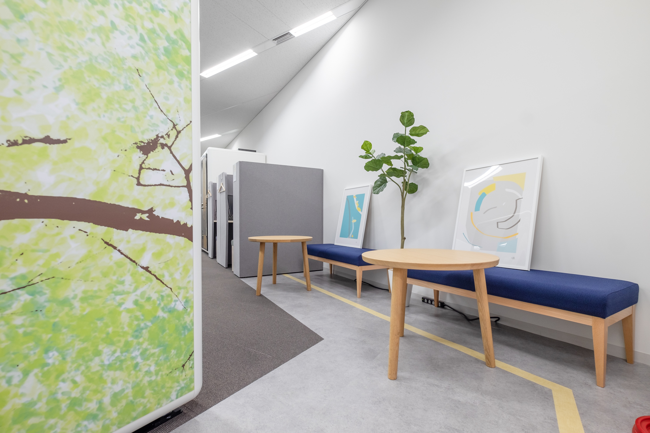落ち着いた配色のインテリアや植栽を配置することで、リラックスできる空間となっています。 オフィス内には飛行場をイメージした箇所があり、個室ブースには飛行機のグラフィックを施し、床には着陸帯のラインがデザインされ、地域に根ざした空間デザインに仕上げました。
