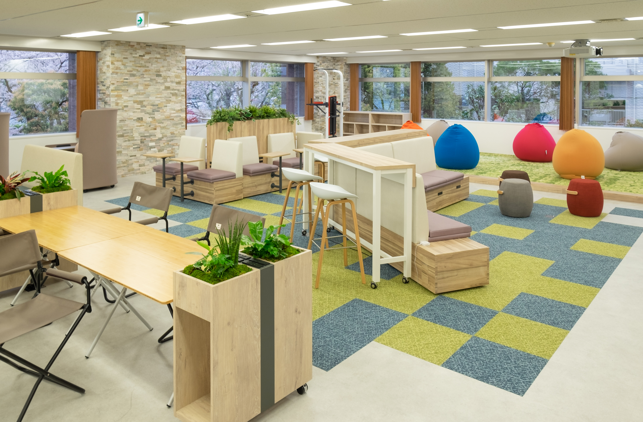 アースカラーをベースに、カラフルなインテリアや休憩スペースを設置することで、リラックスしながら作業効率の向上が期待できます。