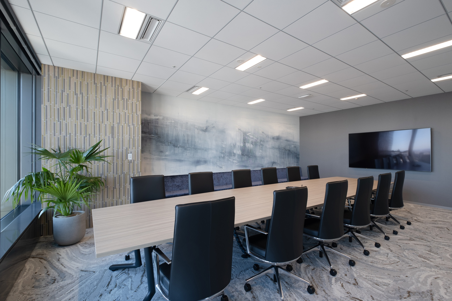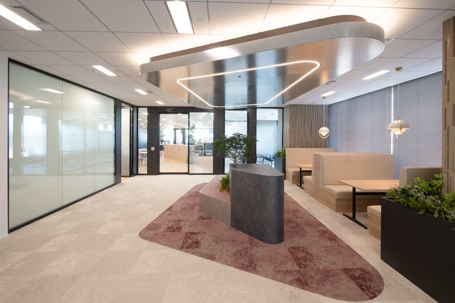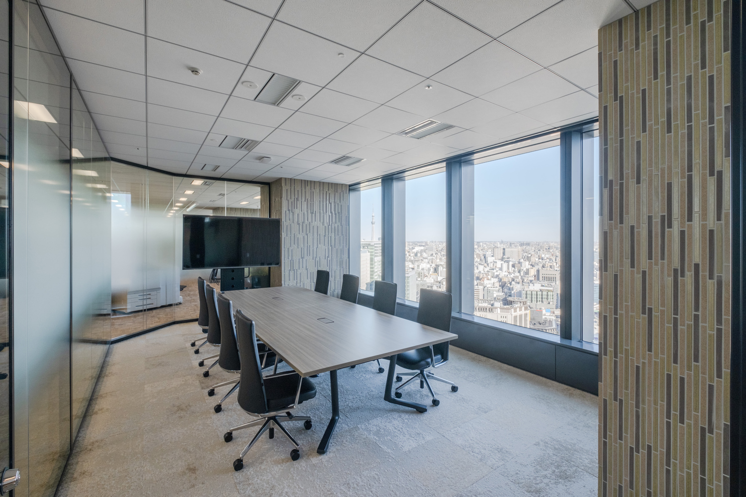 壁、床、天井、間仕切り、空間の細部に至るまであらゆるところにデザインを施し来社した方にインパクトを与える空間に施しました。