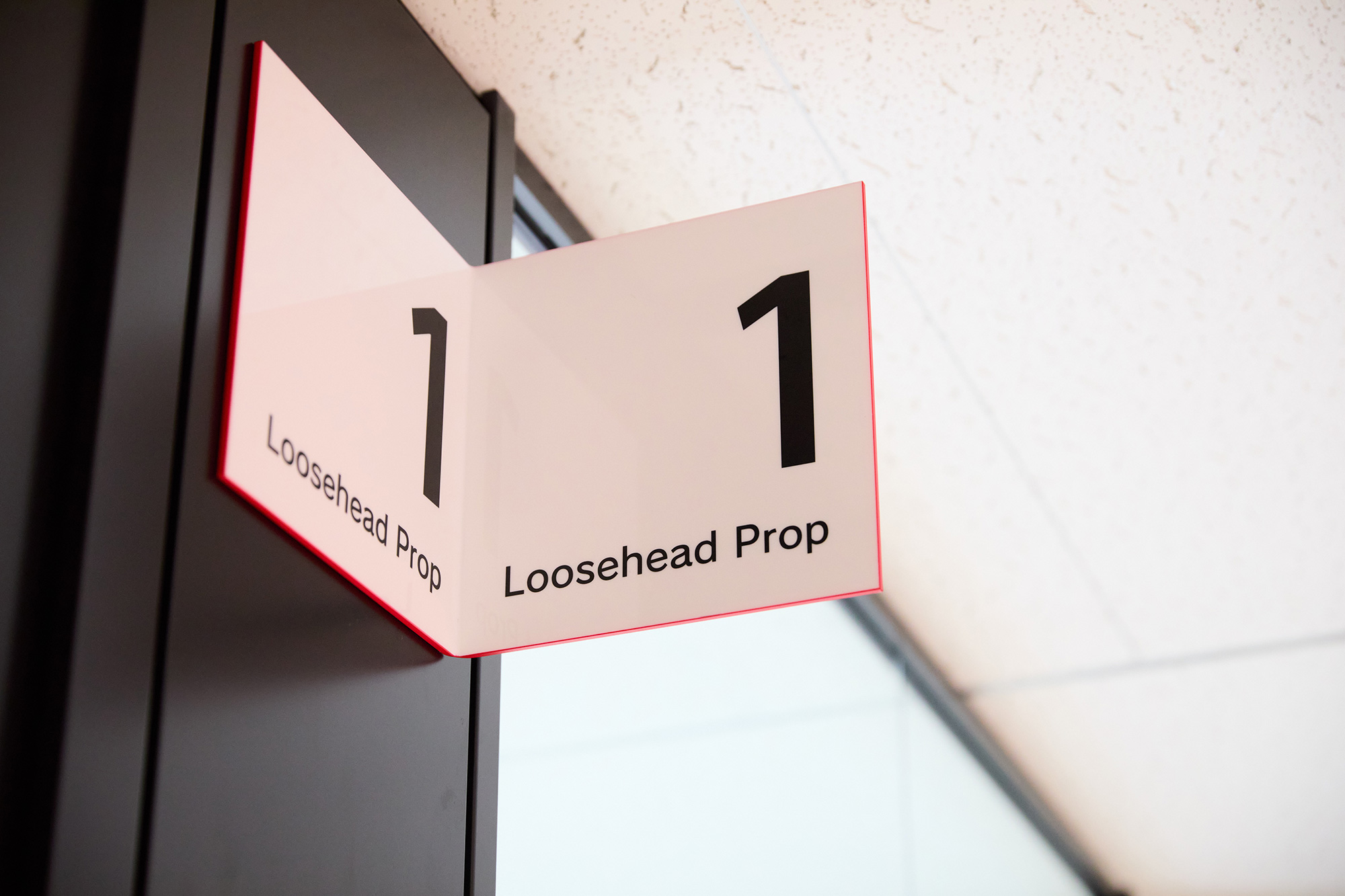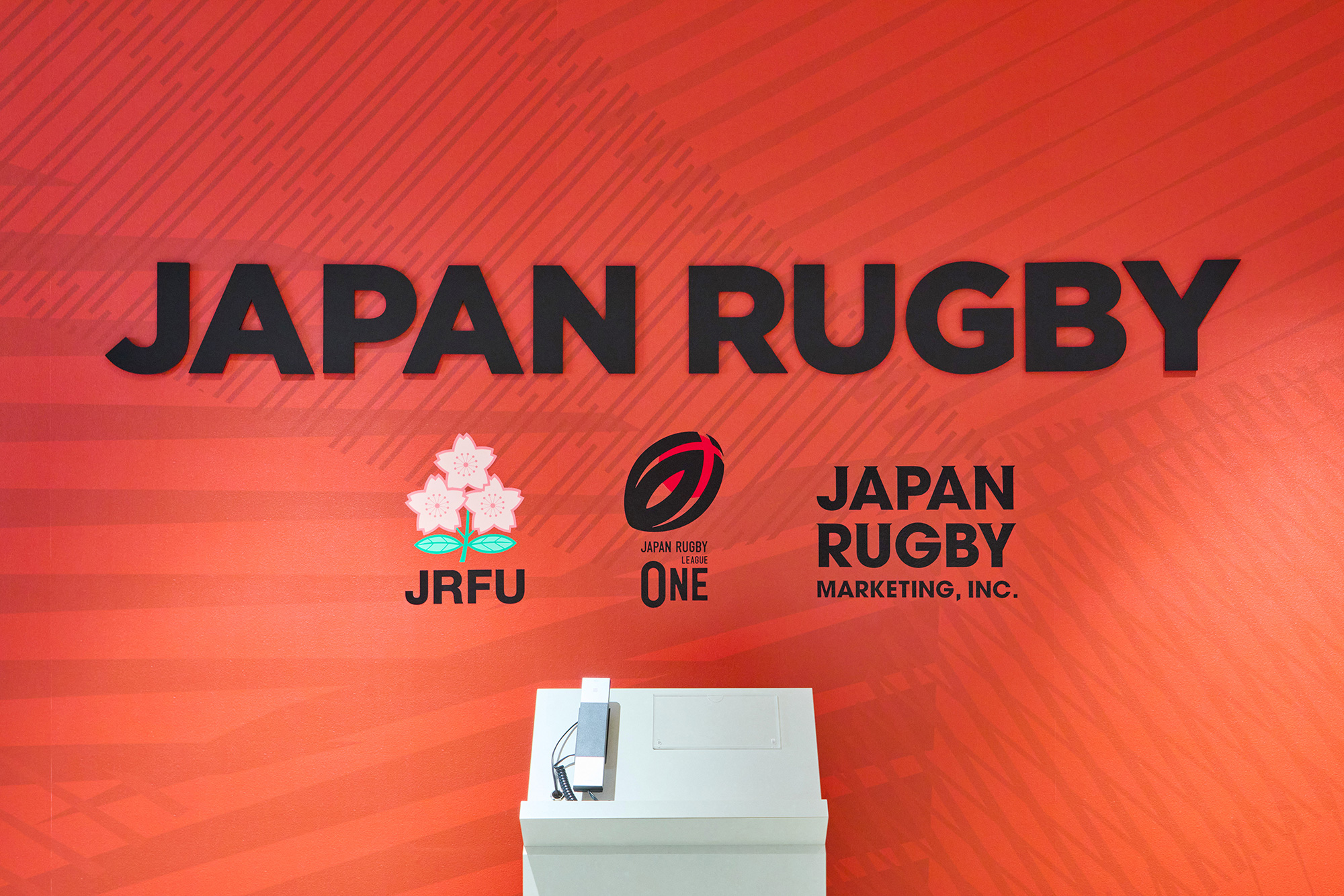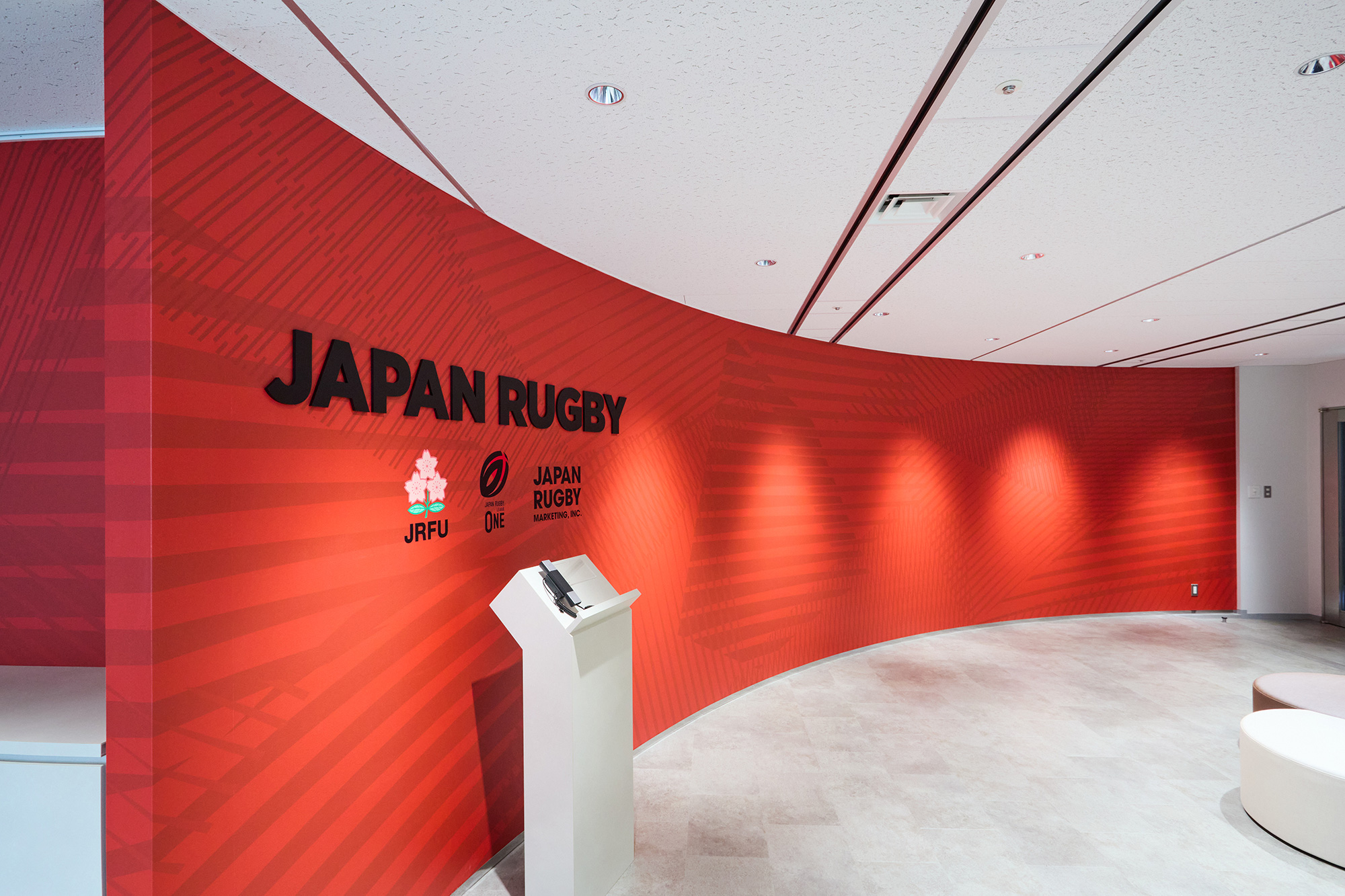 エントランスには赤色を取り入れることで力強い雰囲気に。床は芝生をイメージしたグリーンを用いるなどラグビーの雰囲気をオフィスでも再現しています