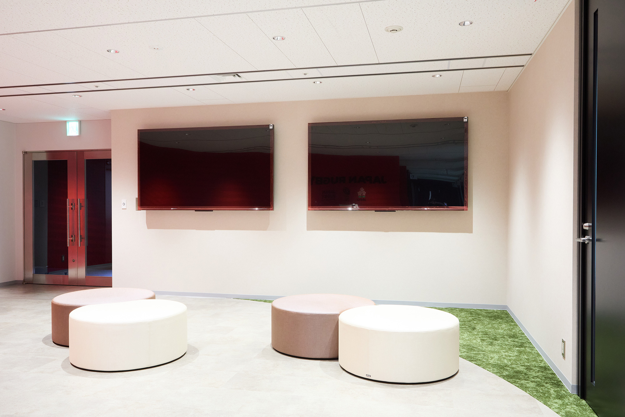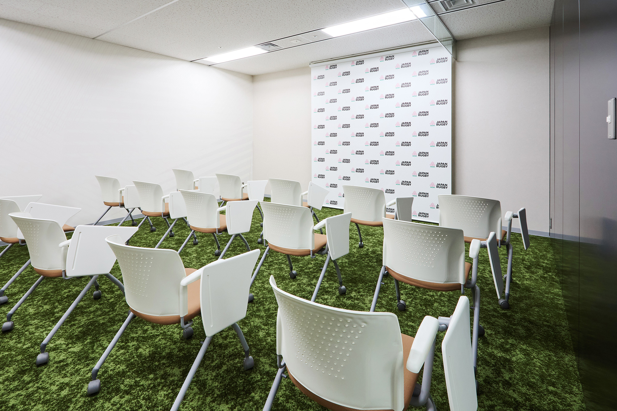 ラグビー協会ならではの空間にするべく、楕円の形や壁面のグラフィックなどこだわり満載の空間。