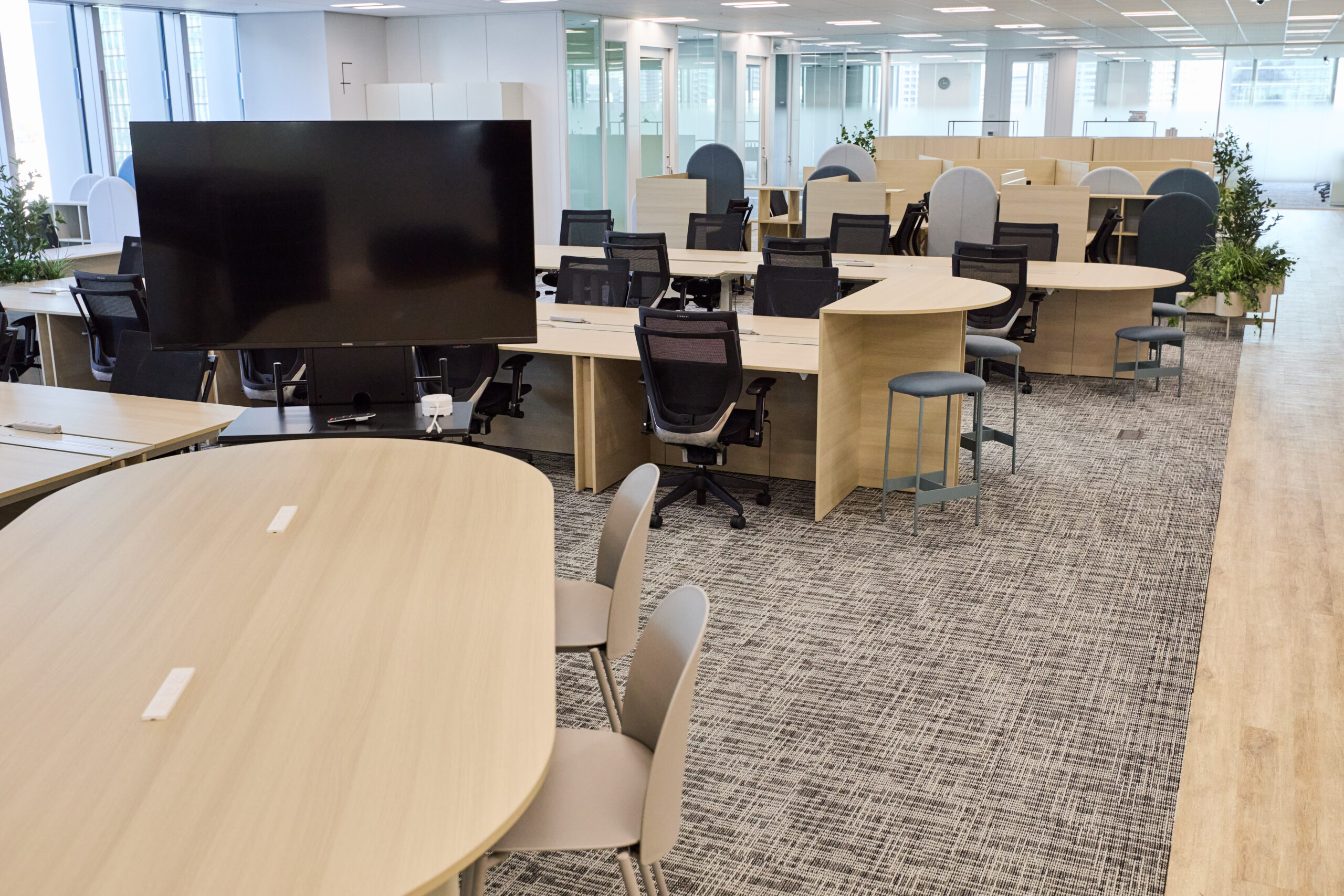 働くシーンや業務内容に応じて最適な環境を選択できるよう、バリエーション豊かなワーク什器を配置し、その日の仕事に合わせて働く場所を柔軟に選べるオフィス空間が計画されています。
